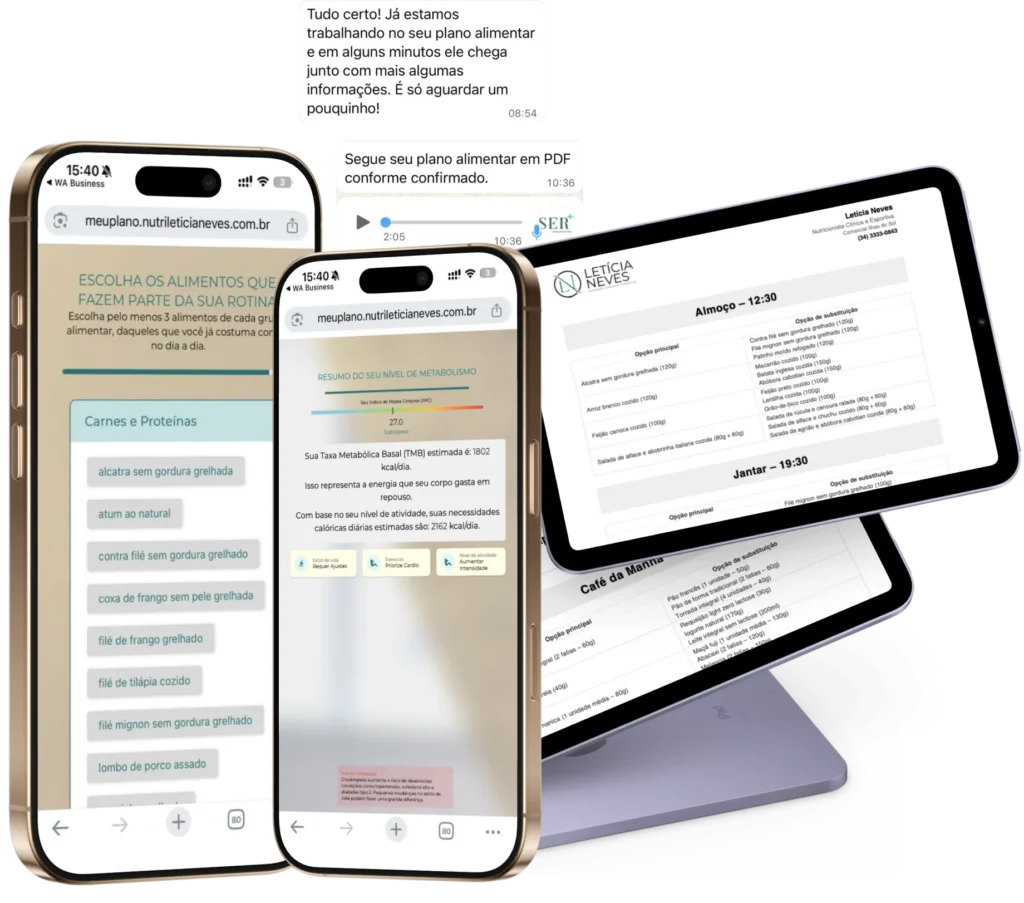É também antropometrista ISAK Nível 1, certificação internacional que permite avaliações corporais completas e precisas. Após anos atendendo e ajudando pessoas a transformarem não apenas o corpo, mas também a relação com a comida, Letícia percebeu que o maior desafio não era falta de força de vontade, mas sim a falta de um plano possível de ser seguido na vida real.